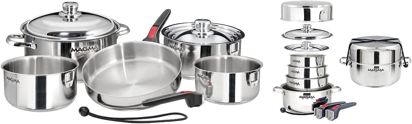 Built from premium 18-8 stainless steel, this model strikes a rare balance: it’s tough enough for daily use yet refined enough to serve in a home kitchen. The removable handles provide easy stacking, while the encapsulated base ensures even heating on induction, gas, or camp stoves. According to Magma, these innovative features make the set ideal for both indoor and on-the-road use.