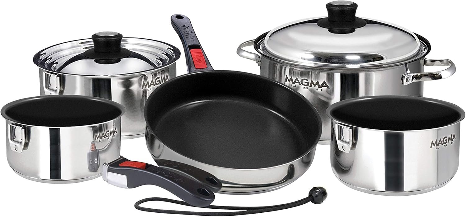 Perfect for van life, camping, or compact kitchens, the Magma 10 Piece Gourmet Nesting Stainless Steel Cookware Set delivers professional-grade cooking on the go. Crafted from durable 18-8 stainless steel, this set features space-saving nesting design, easy one-handed removable handles, and triple-clad bottoms for even heat—even on induction stoves. Oven safe up to 500°F (handles removed), it’s ideal for prepping gourmet meals wherever your adventures take you.
